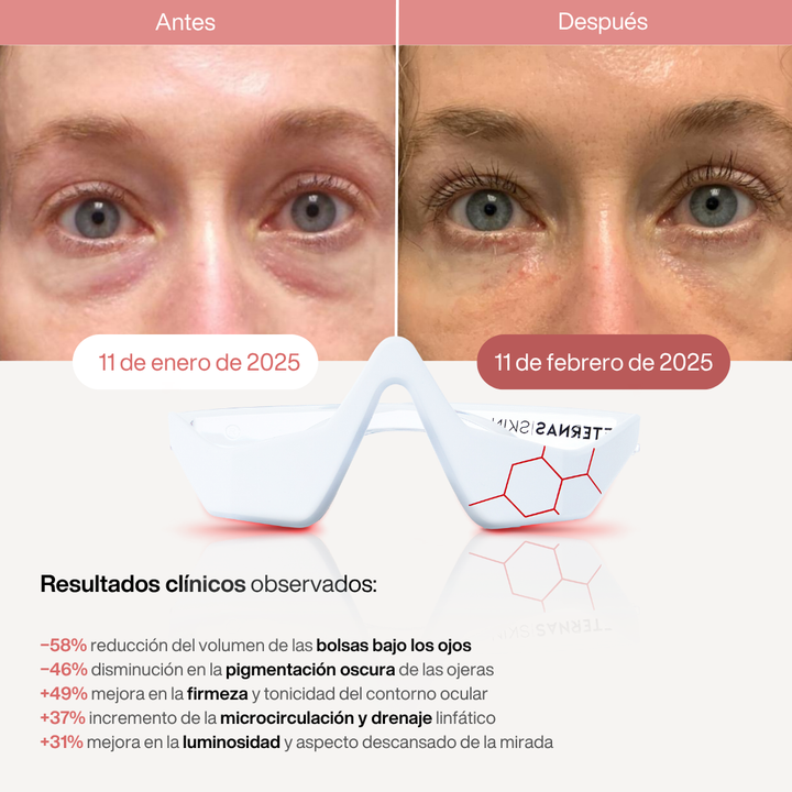 Objetivo del estudio: Analizar el impacto de la terapia combinada de fototerapia LED roja (630nm) y microcorriente EMS en piel joven con signos visibles de fatiga ocular, ojeras pigmentarias y bolsas leves por retención.