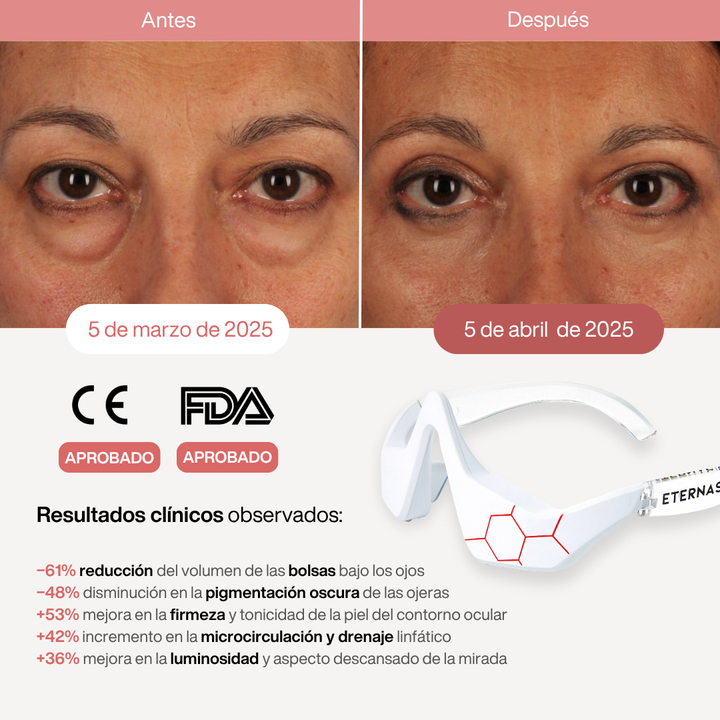 El Reparador de Bolsas y Ojeras LED y EMS de Eternas combina luz roja y microcorriente para revitalizar el contorno de ojos de forma segura, indolora y desde casa.